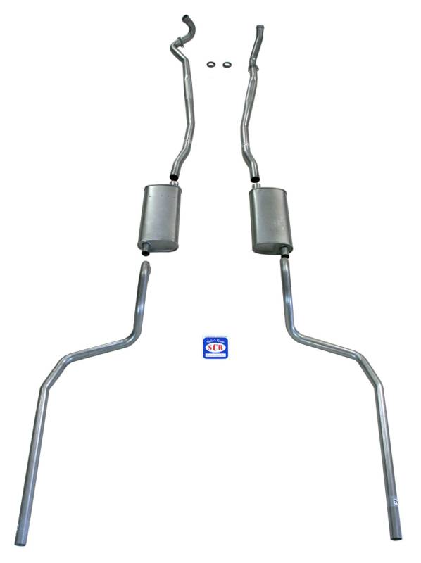 Stock system with 2" tailpipes that exit straight out the back. Sedan and hardtop except station wagon.
